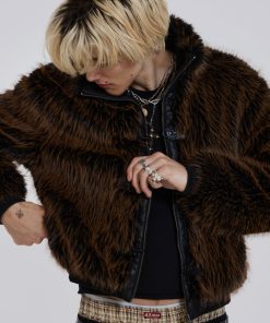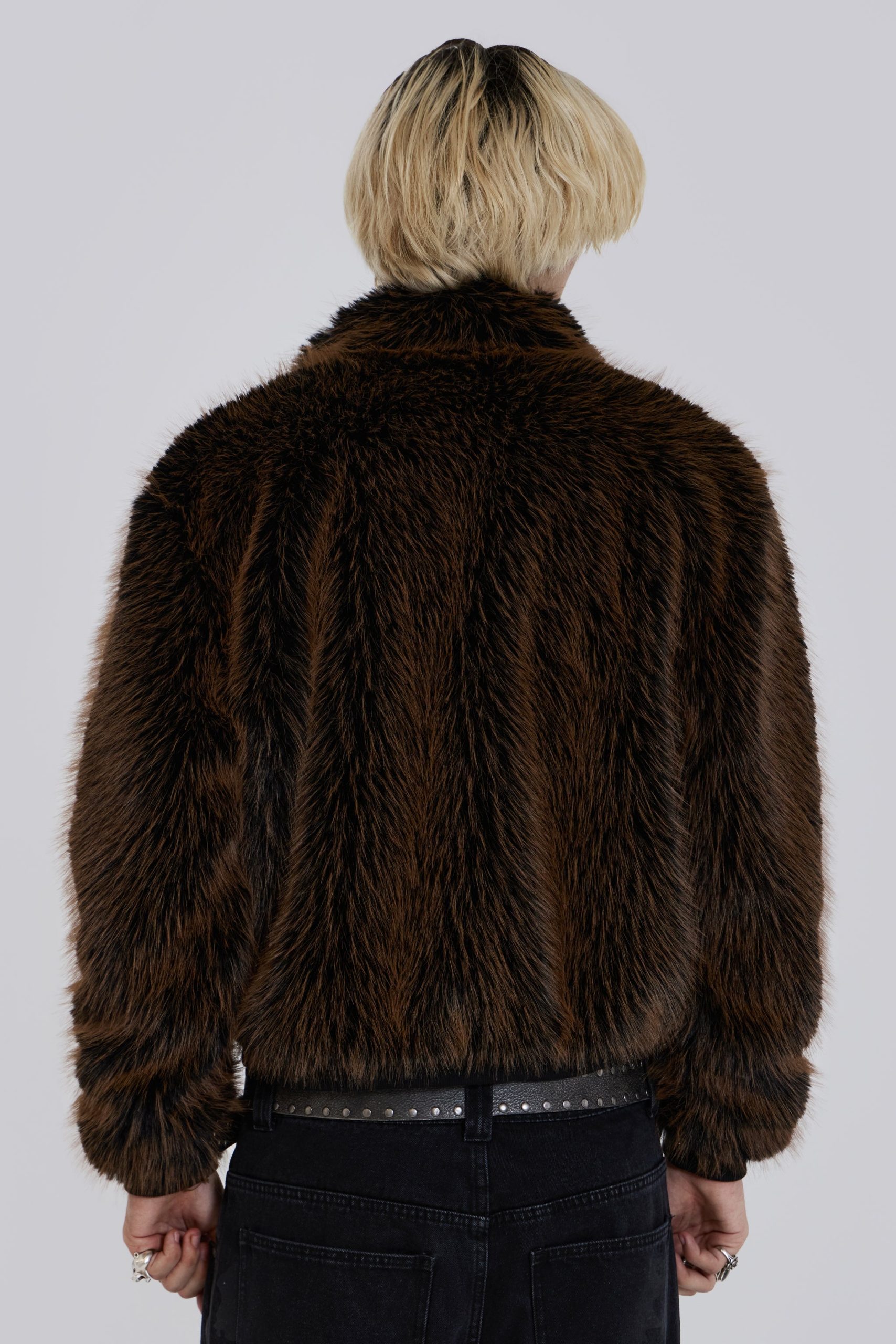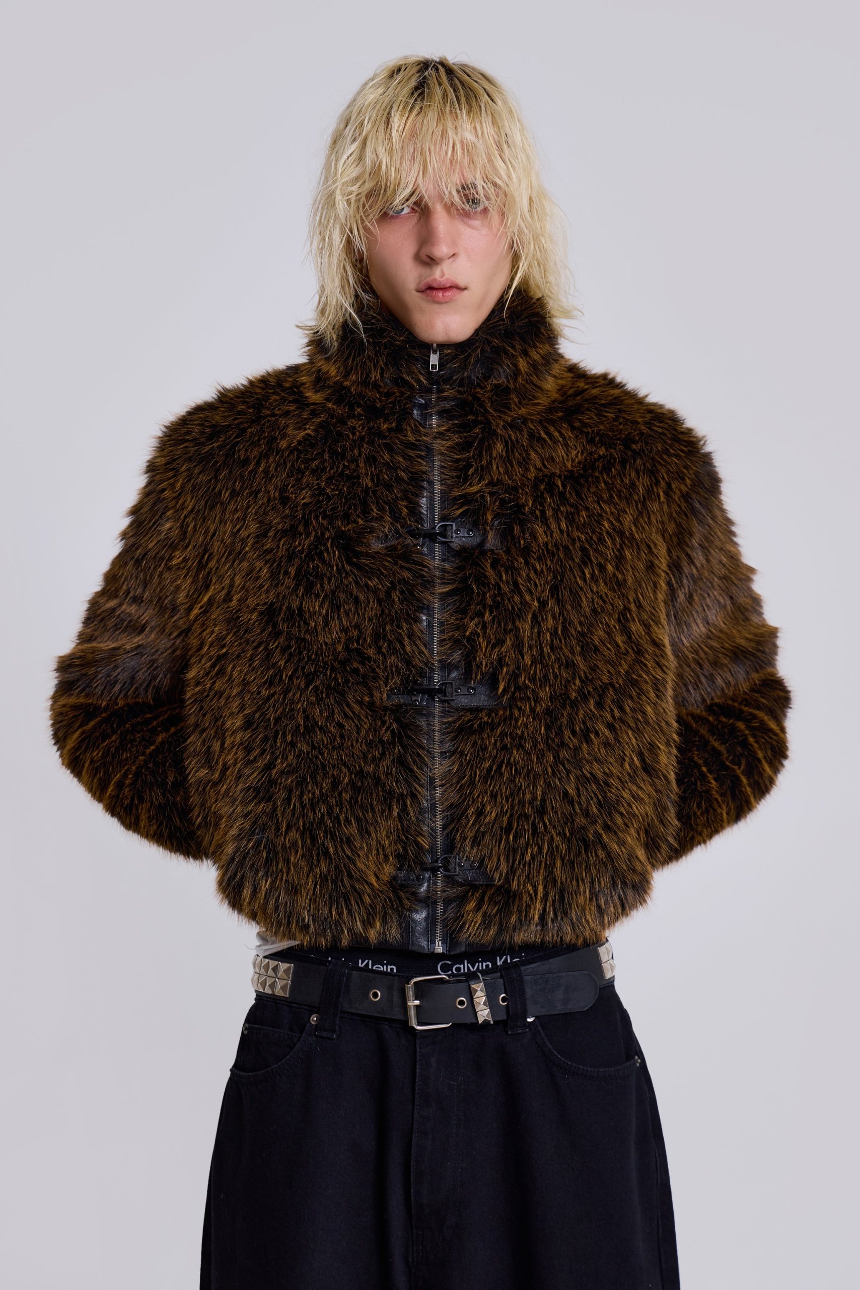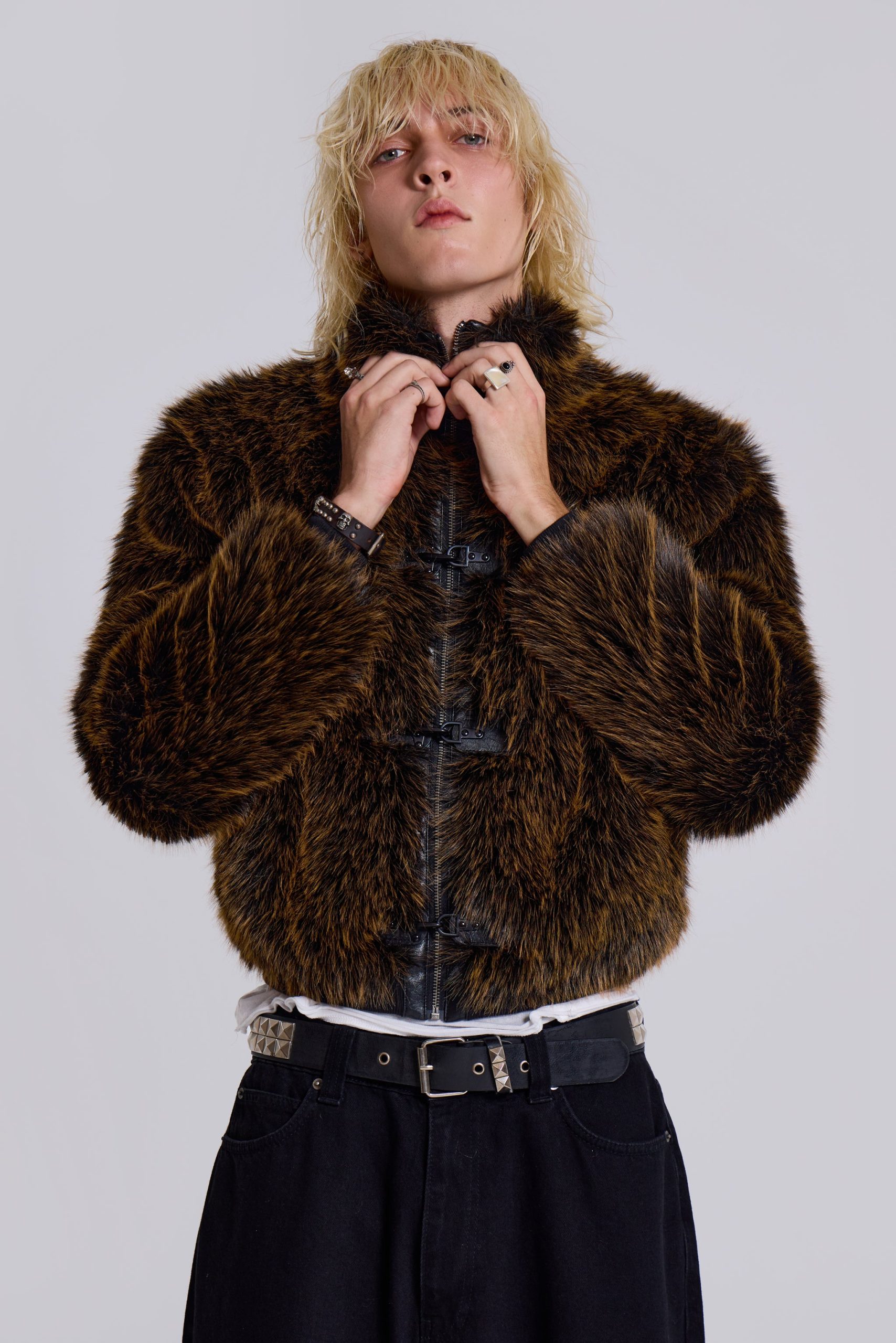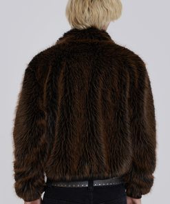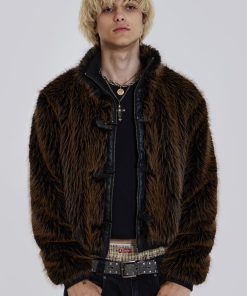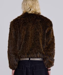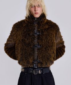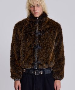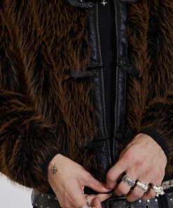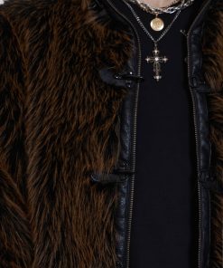 Introducing the Mendoza Faux Fur Jacket – Crafted from a two-tone faux fur, this oversized jacket features a funnel neck collar and faux leather placket. Fastened with four metal claps with side entry pockets and ribbed cuffs and hemband.