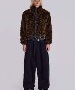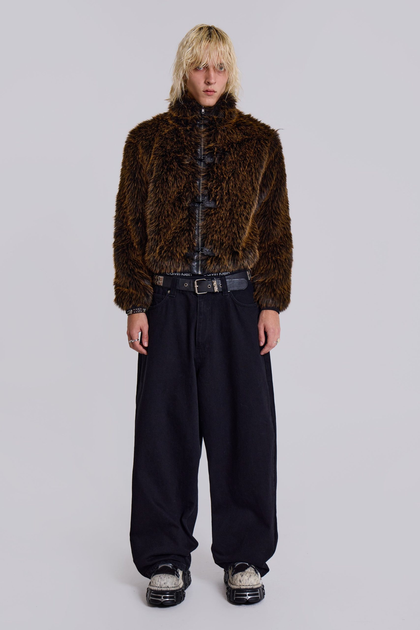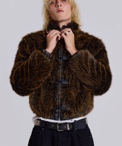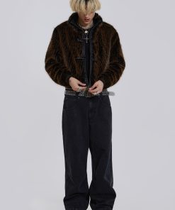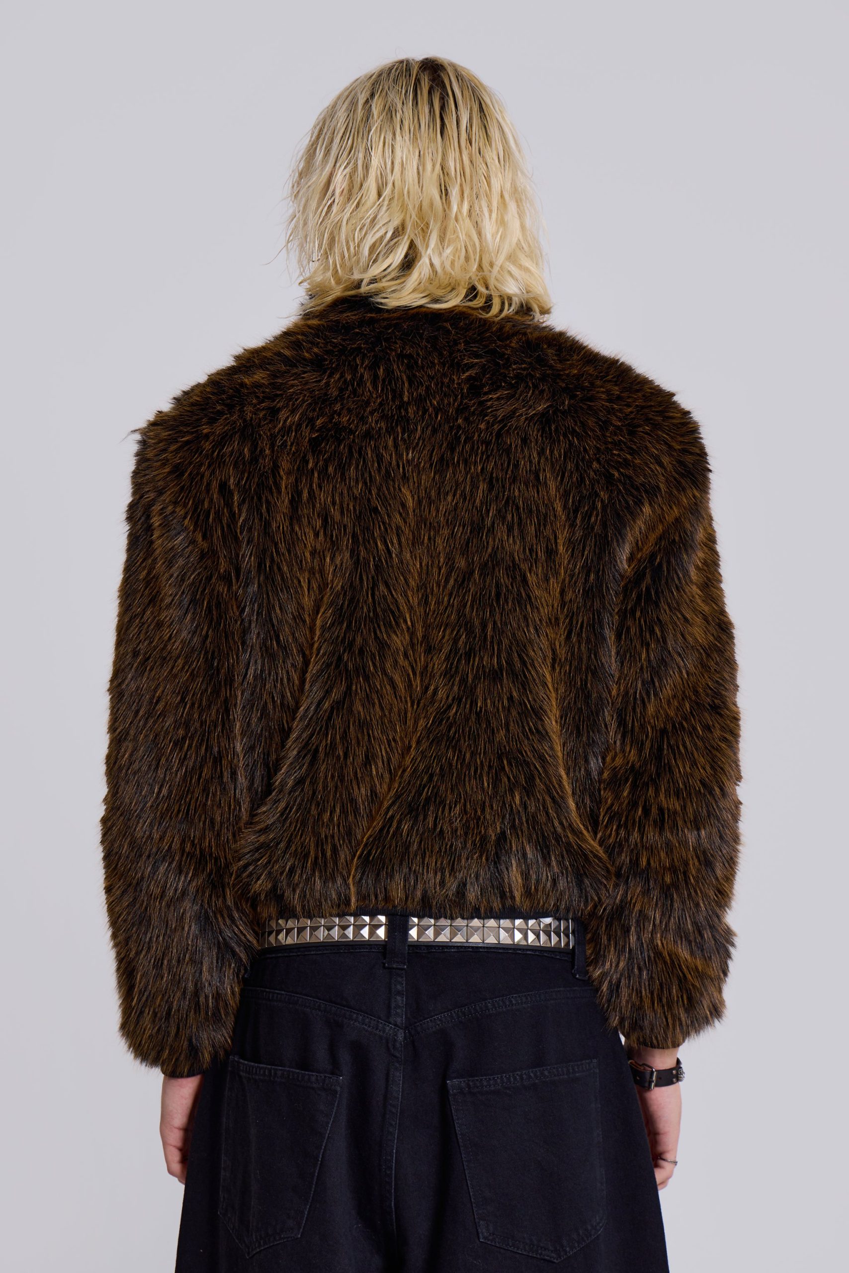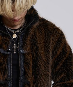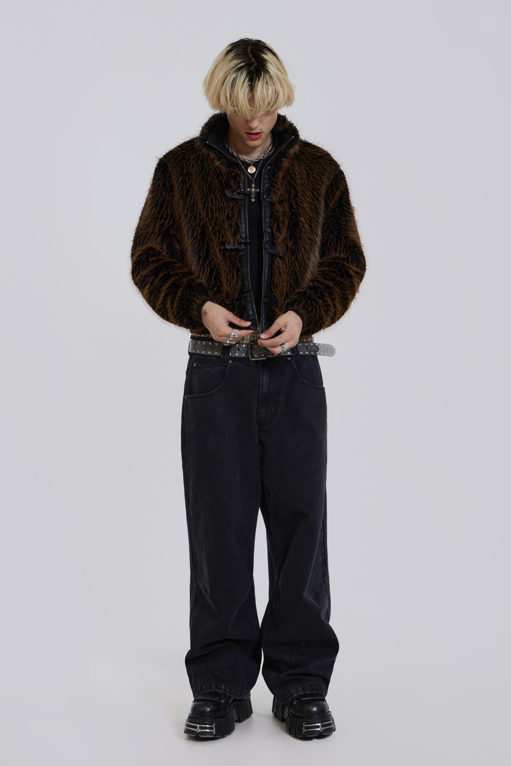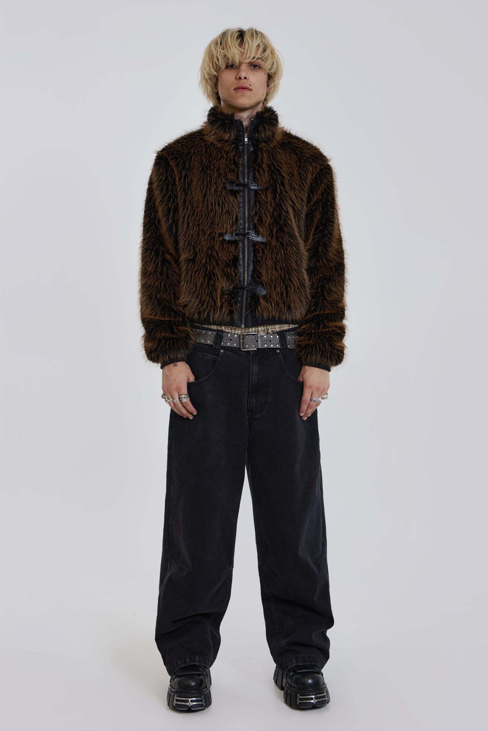 Introducing the Mendoza Faux Fur Jacket – Crafted from a two-tone faux fur, this oversized jacket features a funnel neck collar and faux leather placket. Fastened with four metal claps with side entry pockets and ribbed cuffs and hemband.