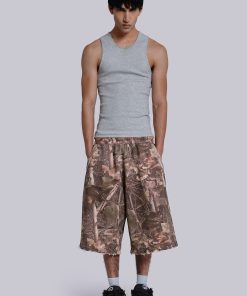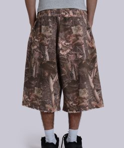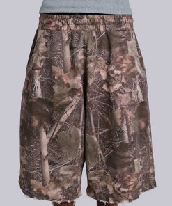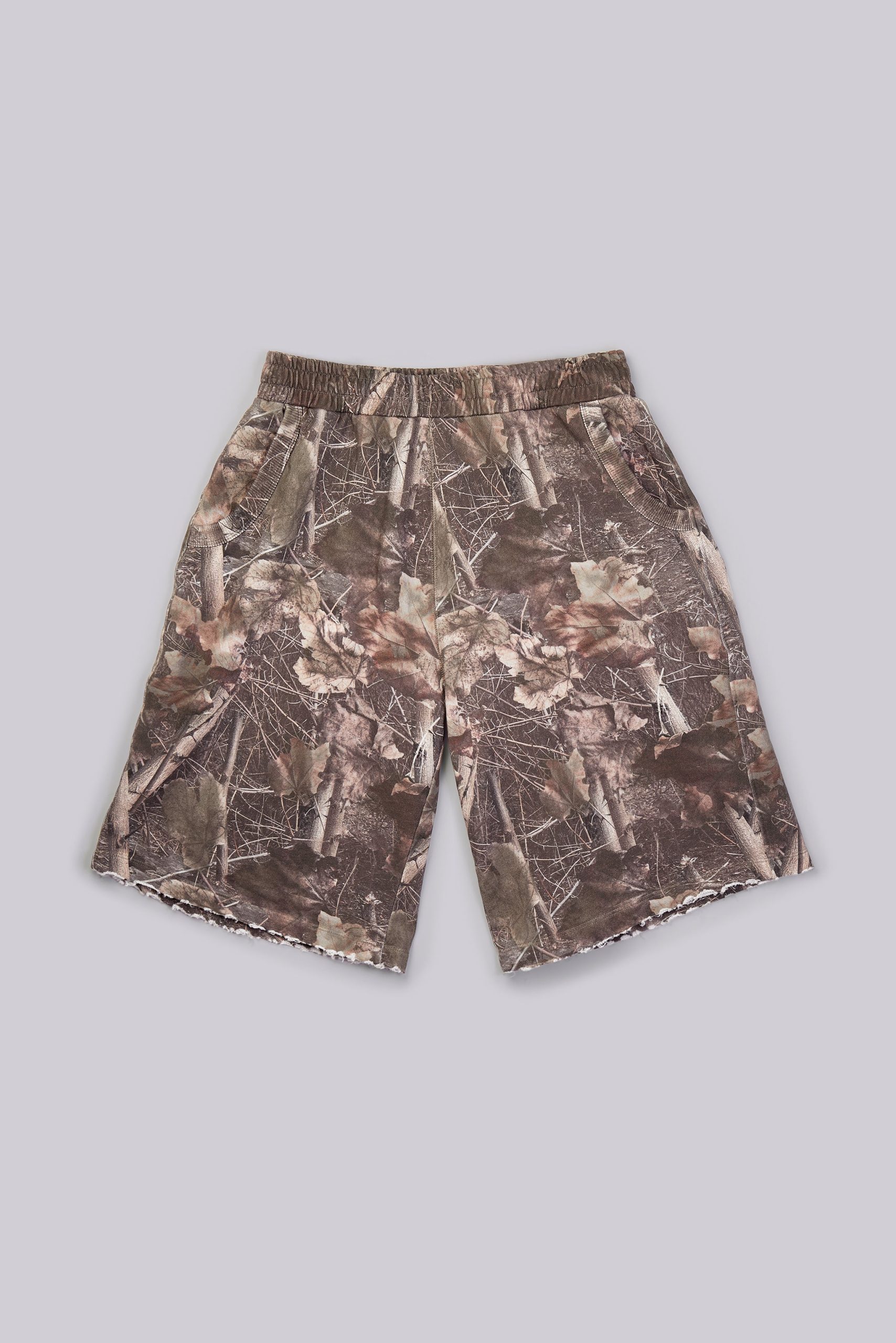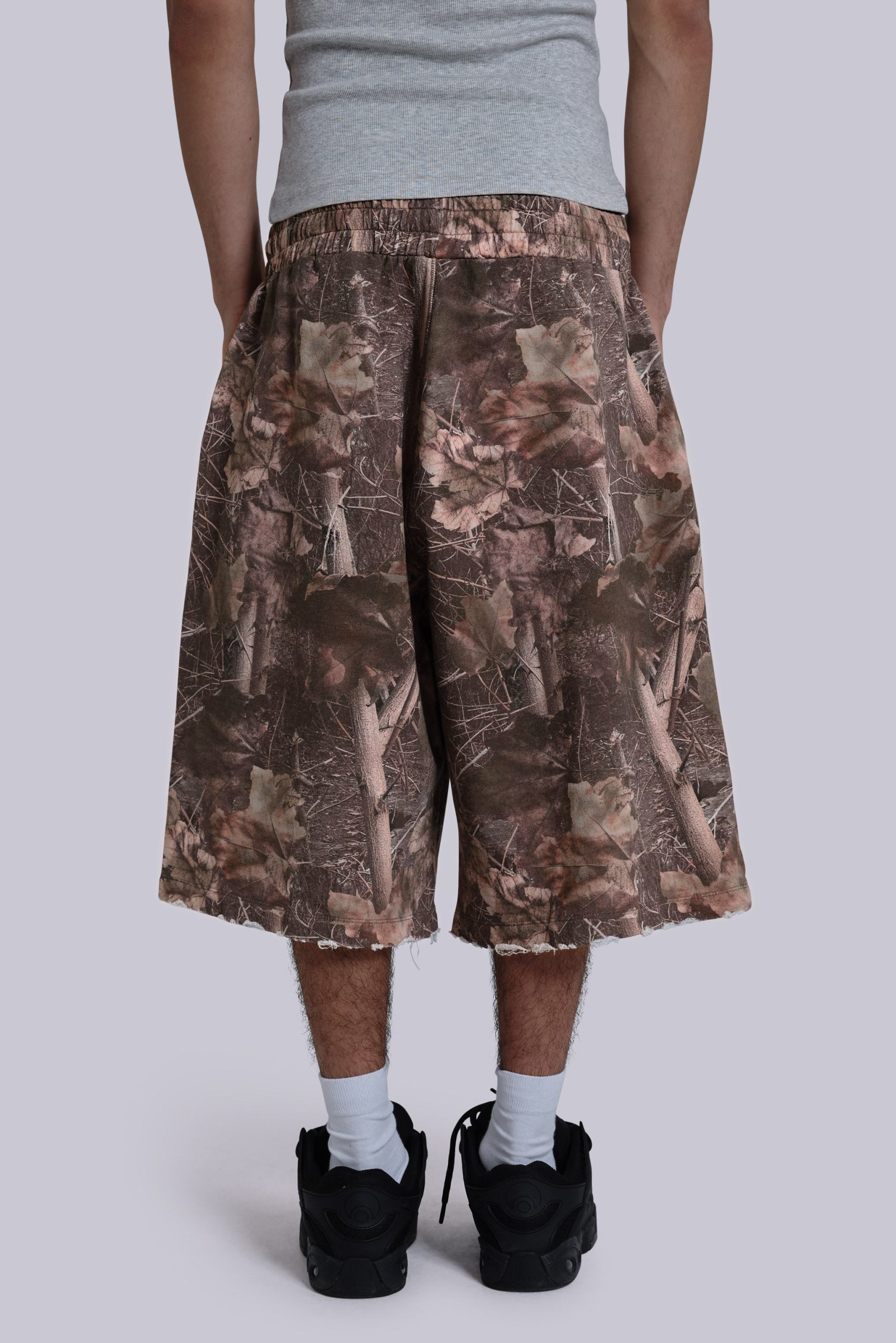 The Woodland Camo Monster Jogger Shorts are crafted from a fleece-back heavy sweat fabric boasting a super oversized fit, finished with raw-edge waistband details. These joggers are elevated with a length that falls just below the knee.