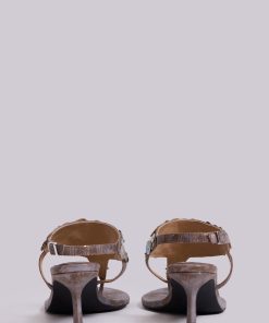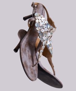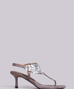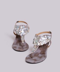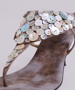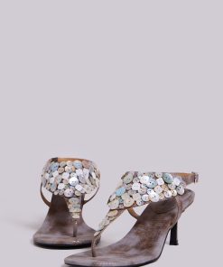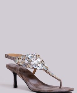 Mottled metallic PU leather thong heeled sandals with decorative buttons and ankle strap.
