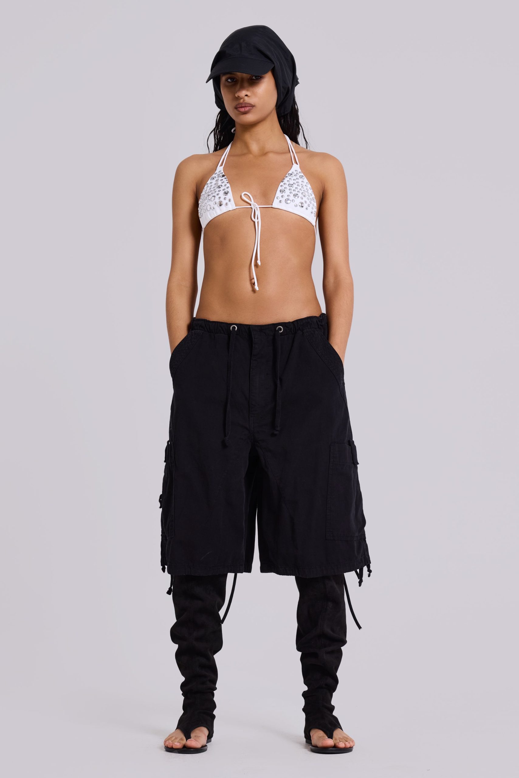 - Elasticated waistband with adjustable cotton drawcord through metal eyelets