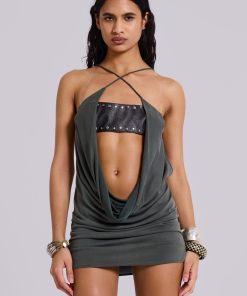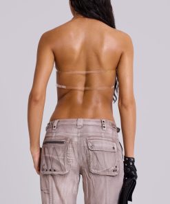 DescriptionCensored PU Leather Bralette Top. Halter backless PU leather micro bandeau bralet top with silver stud details and illusion clear straps.