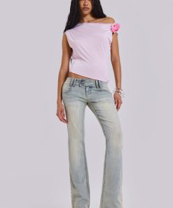 The Dare To Drape In Pink With Flower Detail features an asymmetric design with a raw edge finish. Crafted in a draped slinky jersey fabric, this top has been designed with a gathered shoulder detail.