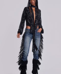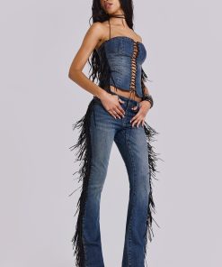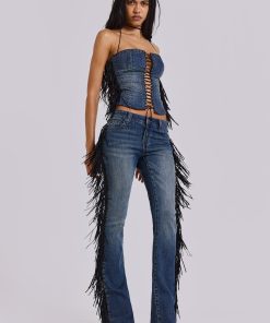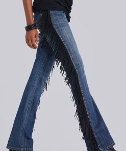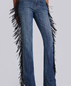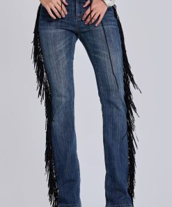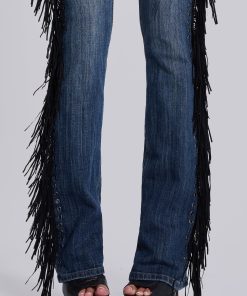 DescriptionDark wash bootcut jean with side seam fringing and eyelet detail.