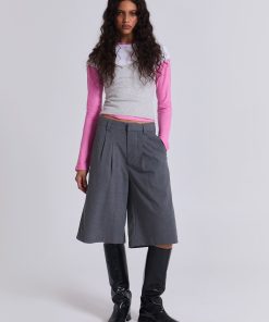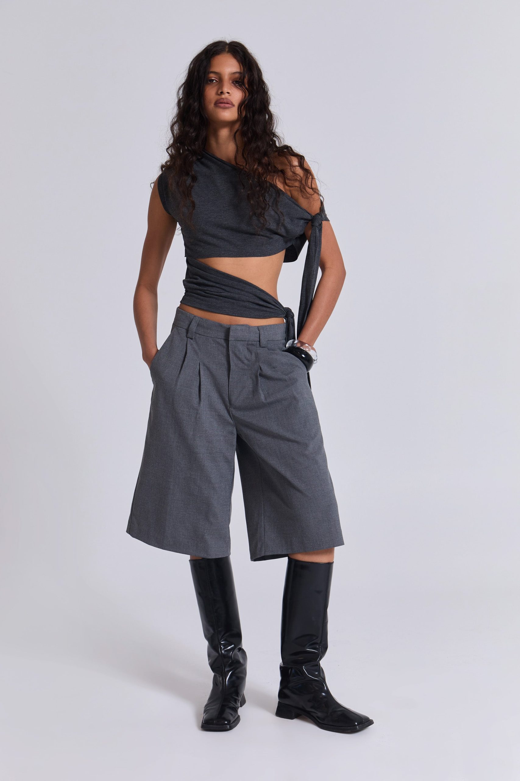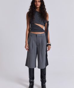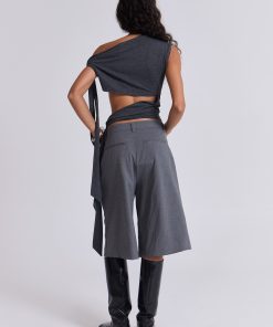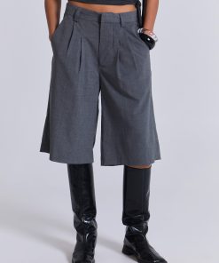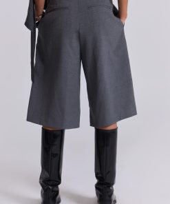 DescriptionCrafted in a cotton blend and designed with an oversized fit, these grey volume tailored shorts feature a fixed waistband with belt loops along with a twin pleat at the waistband for added volume and back jet pockets.