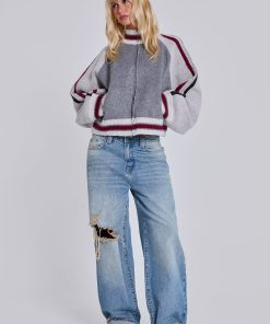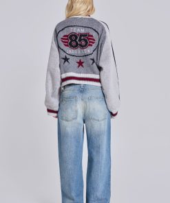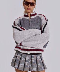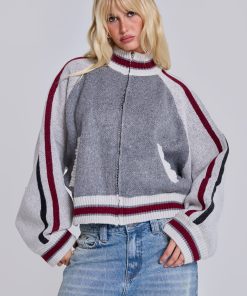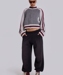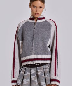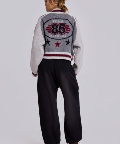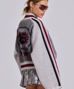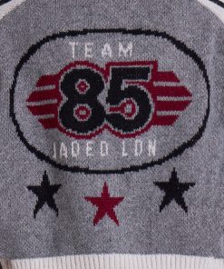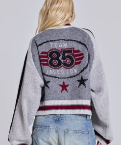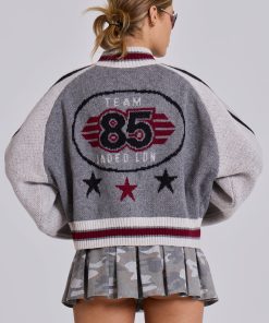 Team 85 Knitted Bomber Jacket. Team Jaded Knitted Zip Through bomber in a heavyweight chunky knit fabric and an oversized cropped fit. This jacket features a funnel neck collar with patch front pocket detailing.