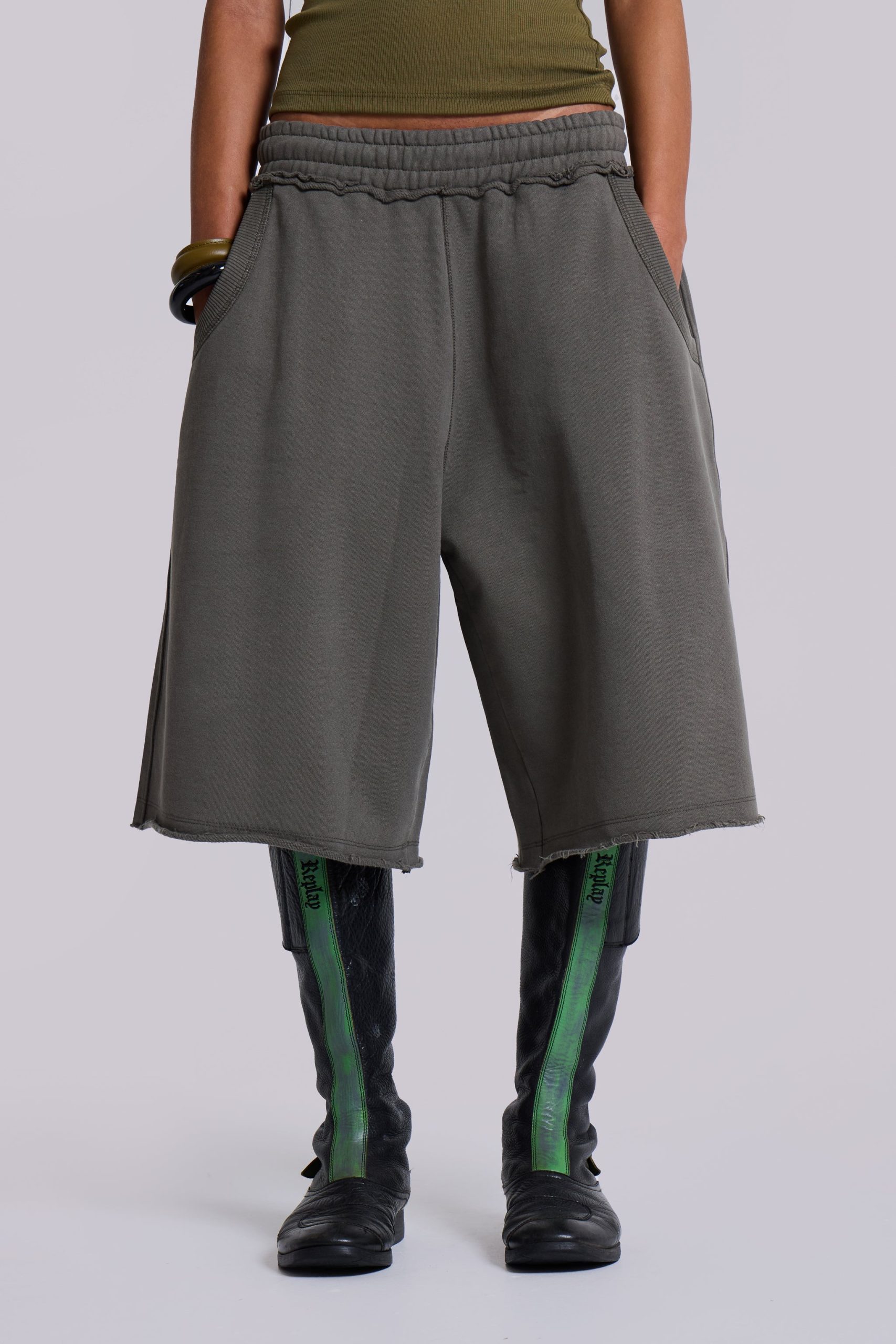- Raw edge waistband details