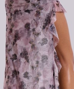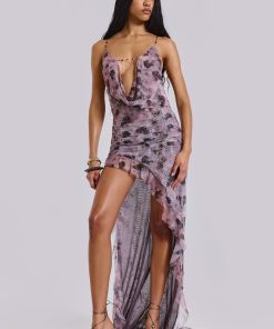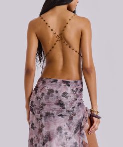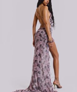 Maeve Backless Maxi Dress. Maxi length dress with high front split with ruffled skirt edge featuring cowl neckline and thin metal straps.