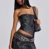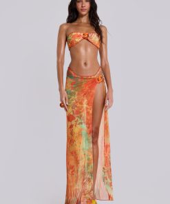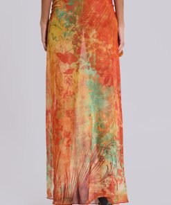 Mesh printed maxi beach skirt with rattan chain trim detail.