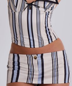 Navy, blue and cream Girlfriend satin halter neck corset in stripe pattern print with sailor-style satin lapel collar. Part of a co-ord.