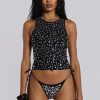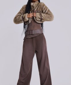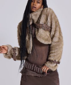 Cropped high neck faux fur jacket with faux leather belts.