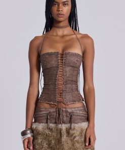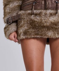 Faux washed leather skirt with faux fur trim and front zip fastening.