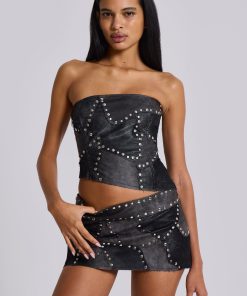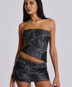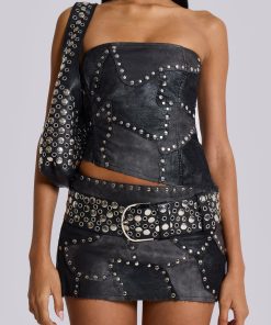 Shadow Studded Corset Top. Pu and faux suede panelled asymmetric corset with stud detailing around each panel. Studs are of varying size in silver colour.