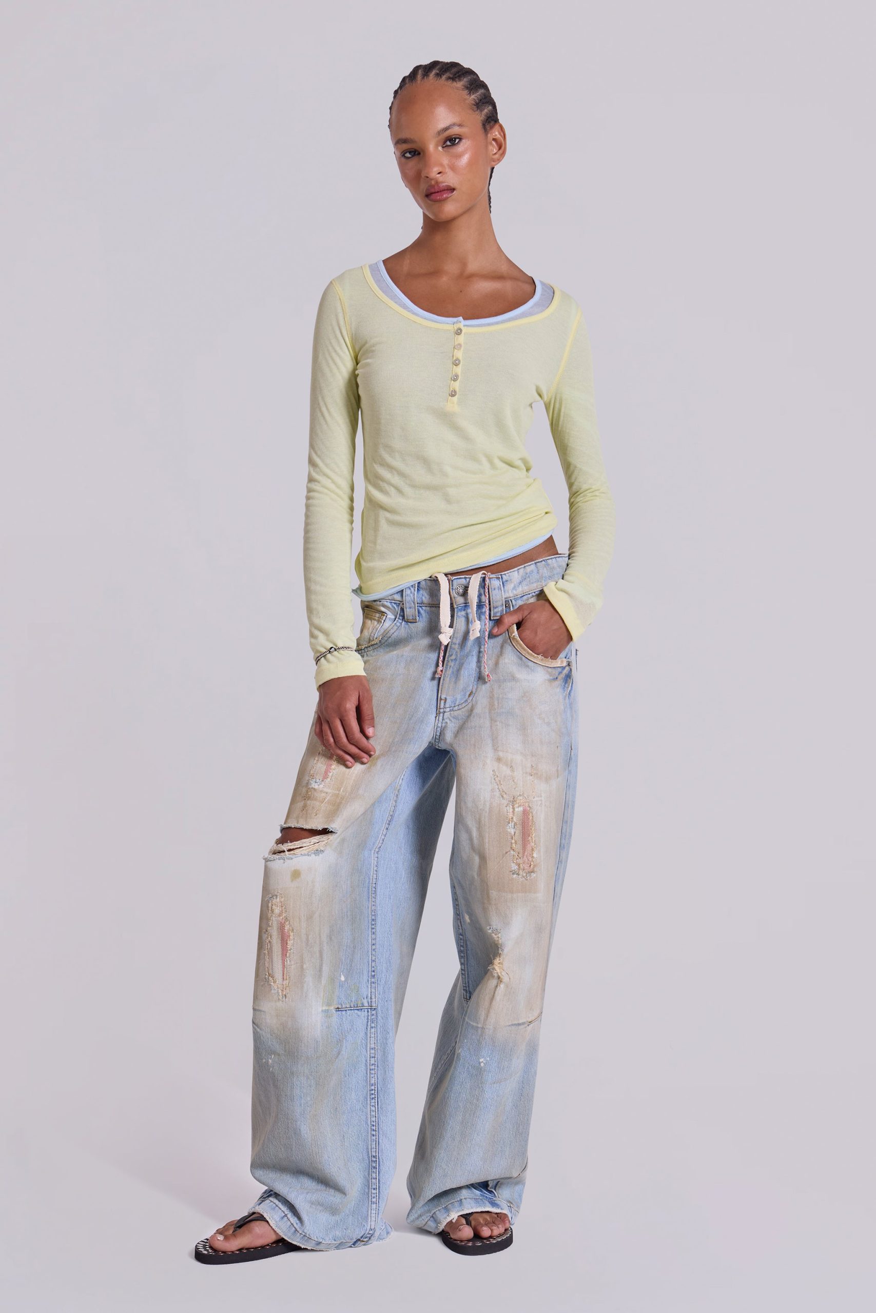- Henley style button down neck detail