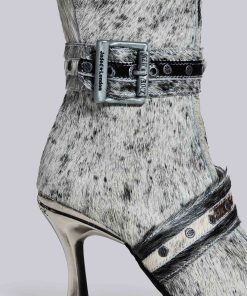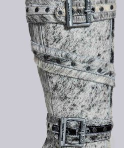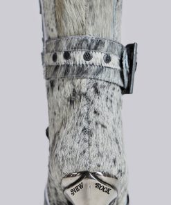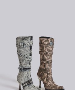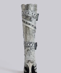 New Rock for Jaded London strap-up knee-high pointed boots in monochrome featuring branded buckles and curved heel with metal finish.