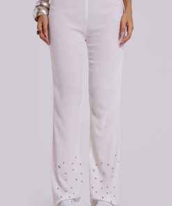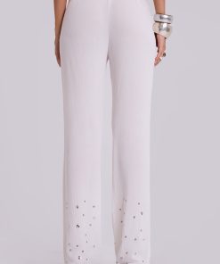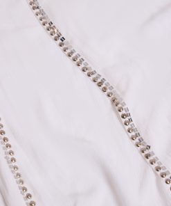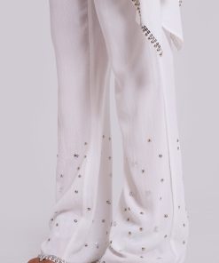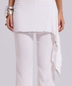 DescriptionWhite lightweight woven multiway skirt over trousers with stud and sequin embellishment. Skirt can button on and off to be worn separately.