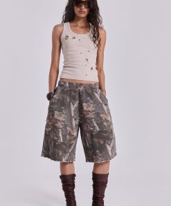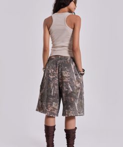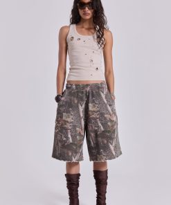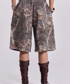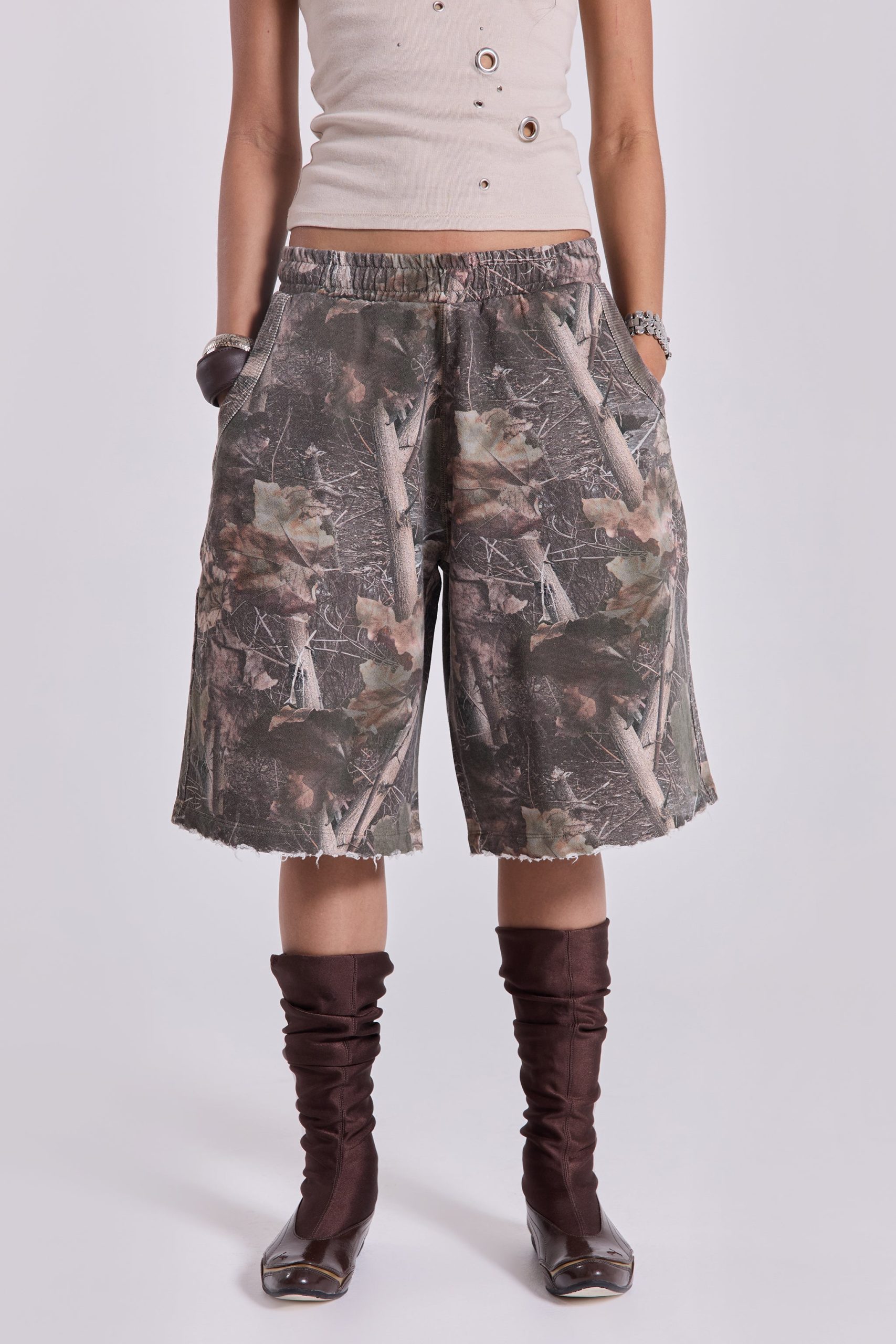 The Woodland Camo Monster Jogger Shorts are crafted from a fleece-back heavy sweat fabric boasting a super oversized fit, finished with raw-edge waistband details. These joggers are elevated with a length that falls just below the knee.