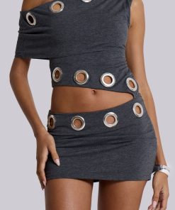 Zarco Asymmetric Mini Dress With Eyelets. Asymmetric dark grey marl jersey dress with oversized eyelets and a cut out hip shape. Dress is mini length with an asymmetric body shape.